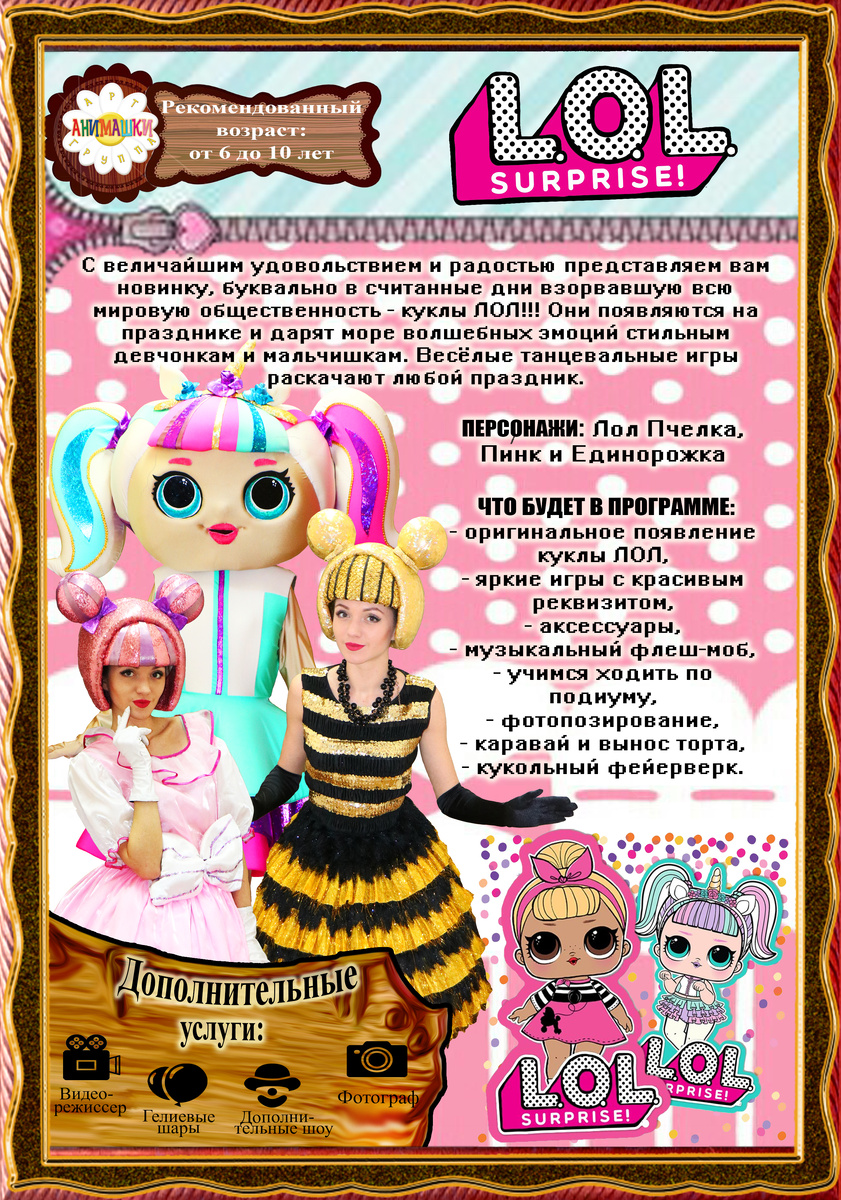 С величайшим удовольствием и радостью представляем вам #новинку, буквально в считанные дни взорвавшую всю мировую #общественность - #куклы #ЛОЛ!!! Они появляются на празднике и дарят море #волшебных #эмоций стильным #девчонкам и #мальчишкам. Весёлые #танцевальные #игры раскачают любой #праздник.