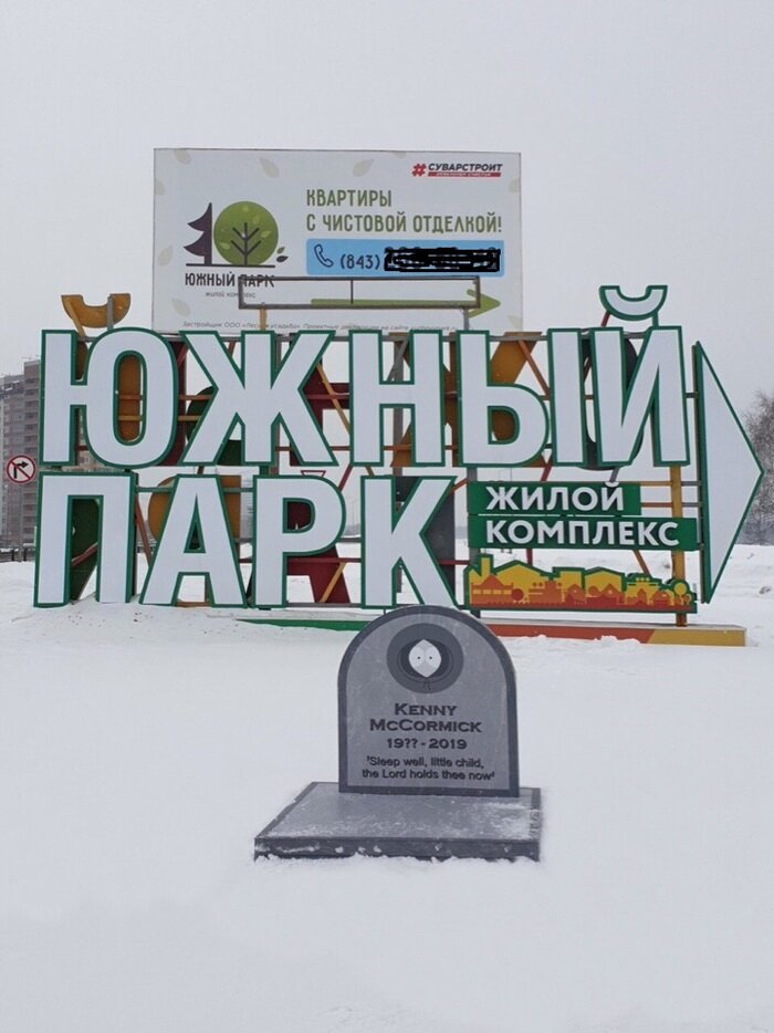 В микрорайоне "Южный парк" города Казани была сконструирована якобы могила Кенни Маккормика. Многой молодежи понравилось чувство юмора того, кто соорудил это. Кто-то даже принес цветы. Но местной администрации - не очень. Сие строение быстро убрали со своего места, видимо Кенни опять воскрес.