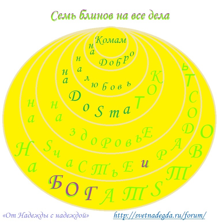 С Масленицей вас, друзья. Первый блин печём не комом, а Комам- предкам. Второй на добро. Третий на любовь. Четвертый на достаток. Пятый на здоровье. Шестой на радость и счастье. Седьмой на Богатство. Семь блинов, и всё, что для хорошей жизни надо, сложили. Всем добра, всех семи уровней доброй жизни, помощи предков и Высшего разума, и всех благ, какие вы только себе можете представить. Всегда с вами, пока вы этого хотите, мастер наставник Надежда Михайловна Мунцева.