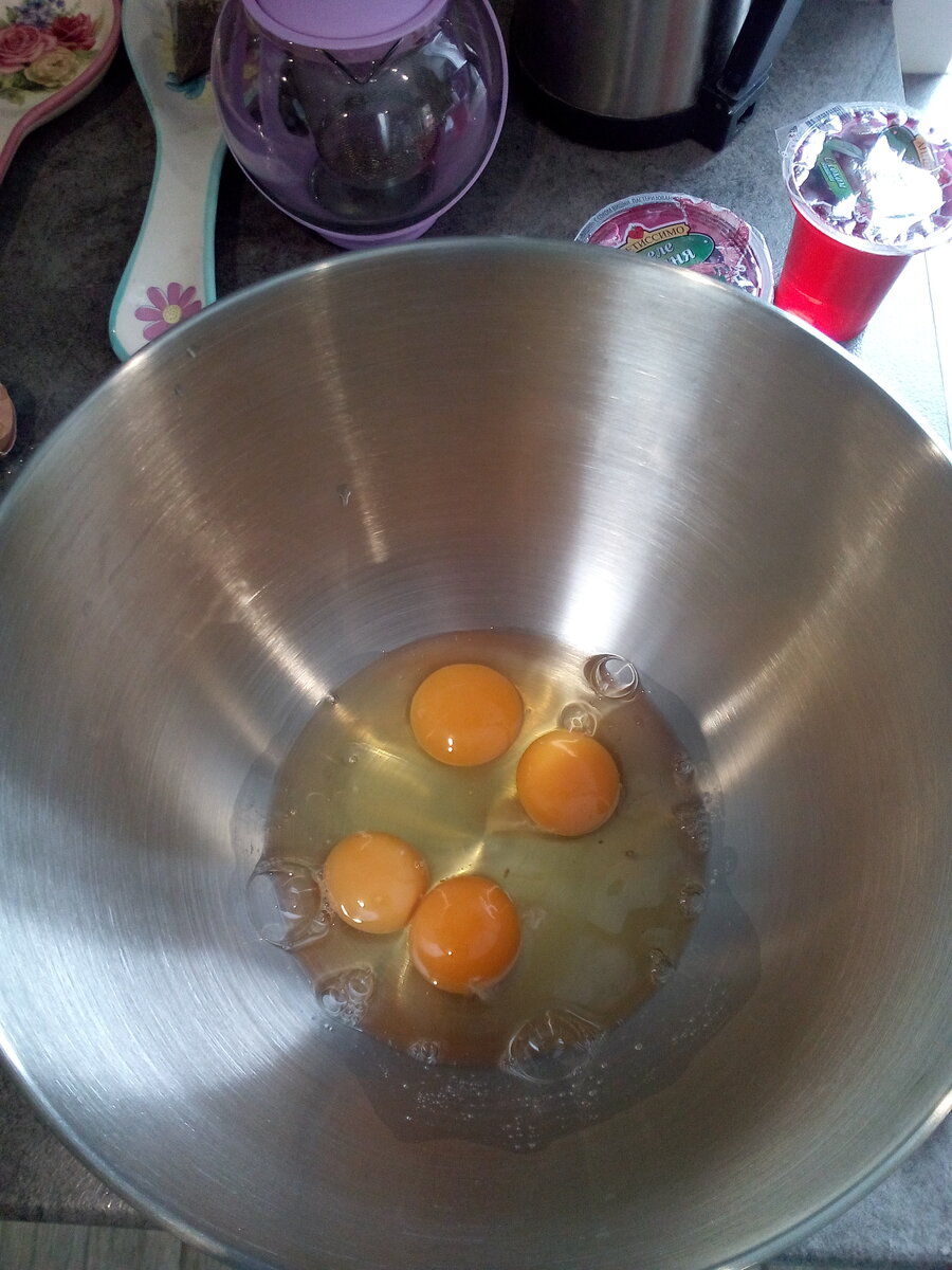 Предлагаю вашему вниманию простой рецепт классического высокого бисквита для ваших тортиков. Бисквит получается нежный и пышный. Берем чистую, сухую емкость. На форму для выпечки 20 см я взяла 4 яйца комнатной температуры. Добавляем щепотку соли и 120 гр сахарного песка. Теперь необходимо взбить хорошо яйца с сахаром. Я взбиваю в планетарном миксере на максимальной скорости минут семь. Можно и обычным ручным миксером, сначала на малых оборотах и постепенно увеличивая скорость. Необходимо добиться белой пышной массы. Если сделаете все правильно и масса приобретет белую и пышную консистенцию, то бисквит получится высоким и пышным. Добавлять соду и разрыхлитель НЕ НАДО. Миксер отставляем в сторону, он нам больше не понадобится. Теперь будем добавлять сыпучие продукты. Мука 104 гр и кукурузный крахмал 24 гр. Если нет кукурузного, можно заменить на картофельный. Смешать муку и крахмал в отдельной емкости, просеить. Затем порциями по две-три столовые ложки добавляем муку с крахмалом в на