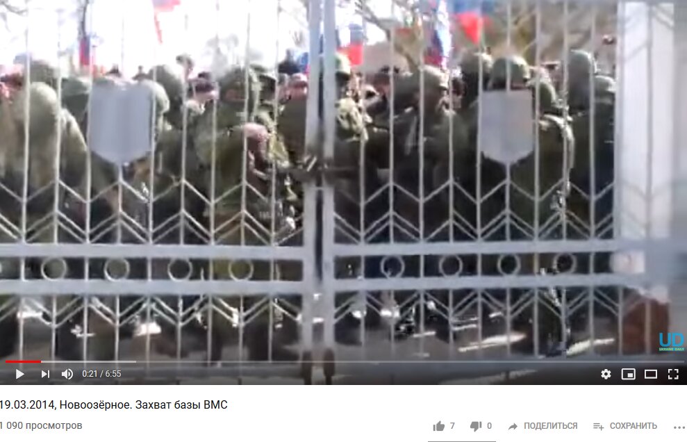 На Украине активно клепают сюжеты о том, как Россия захватила Крым, прикрываясь гражданскими, вырезают из видеозаписей неудобные моменты, монтируют удобные и вставляют воспоминания очевидцев. На Ютубе есть видео "19.03.2014, Новоозёрное. Захват базы ВМС", в котором прекрасно видно, что "зеленые человечки" стояли первой линией около ворот части, за ними - толпа гражданских с российскими флагами.
