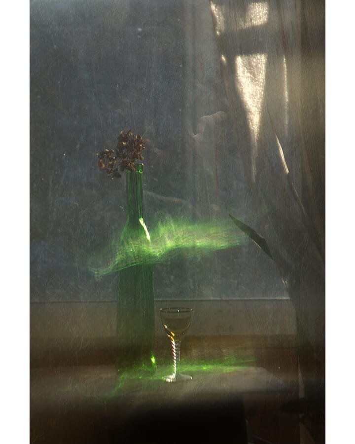 Сияющий, наполненный светом натюрморт снят через неровное стекло, которое умножило блики и сделало кадр ещё более объемным. Очень интересное ощущение от снимка. Как-будто заглядываешь в подводный мир... Смотрю на эти фото и в очередной раз убеждаюсь, что неровное стекло, бутылочки, сляночки - первейшие магические лайфхаки для фотографа.