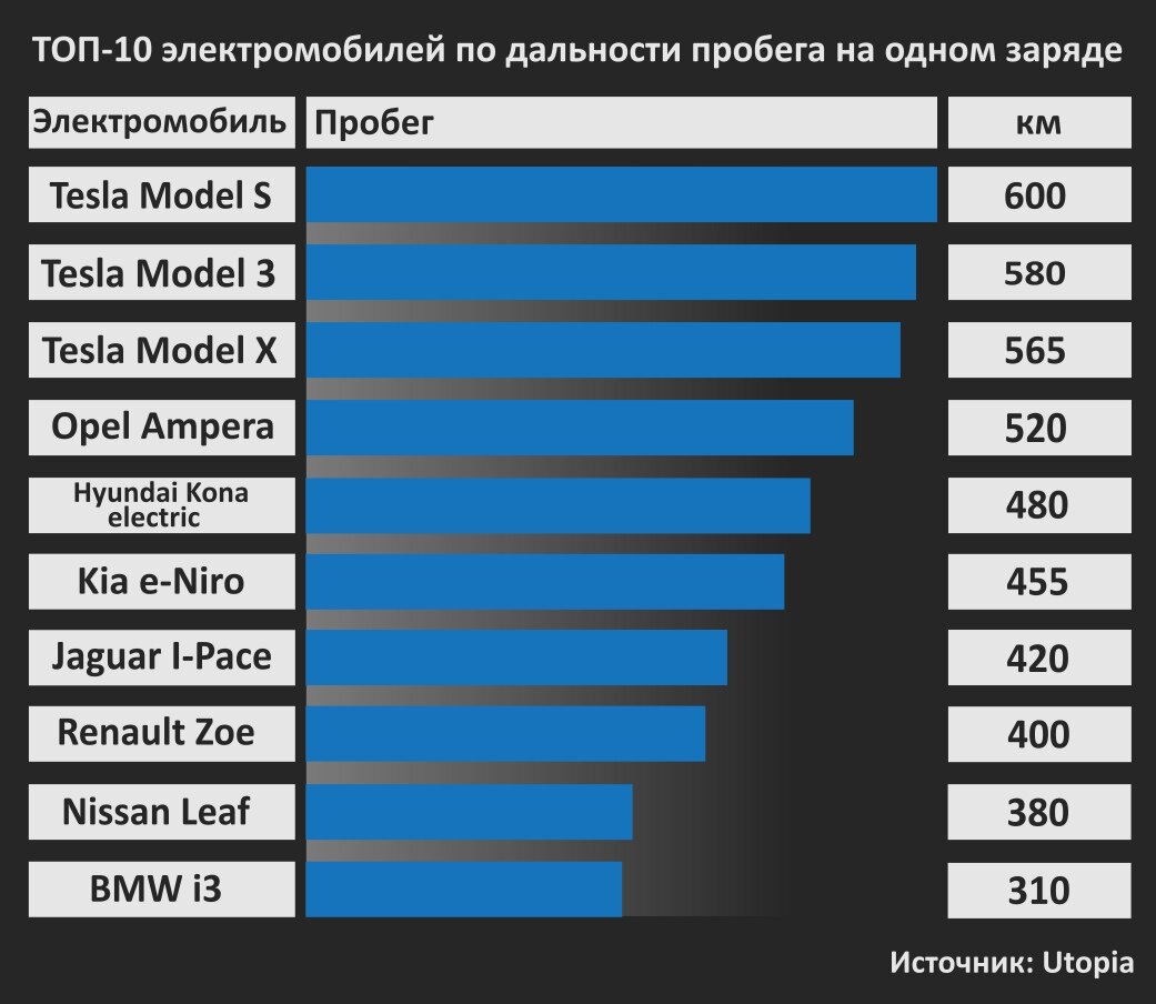 Электромобили Tesla Inc. (SPB: TSLA) занимают первые строчки по дальности пробега после одной зарядки аккумулятора.