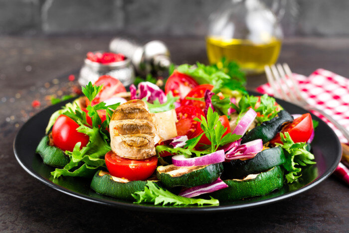 Салат с жареными шампиньонами и свежими помидорами - оригинальная идея для легкого и полезного ужина. Цуккини и грибы для этого салата можно приготовить как дома на сковороде гриль, так и на открытом мангале на загородном барбекю. Шампиньоны лучше всего выбирать средние или крупные, чтобы их удобно было нарезать для жарки. Как приготовить салат с шампиньонами гриль и свежими овощами