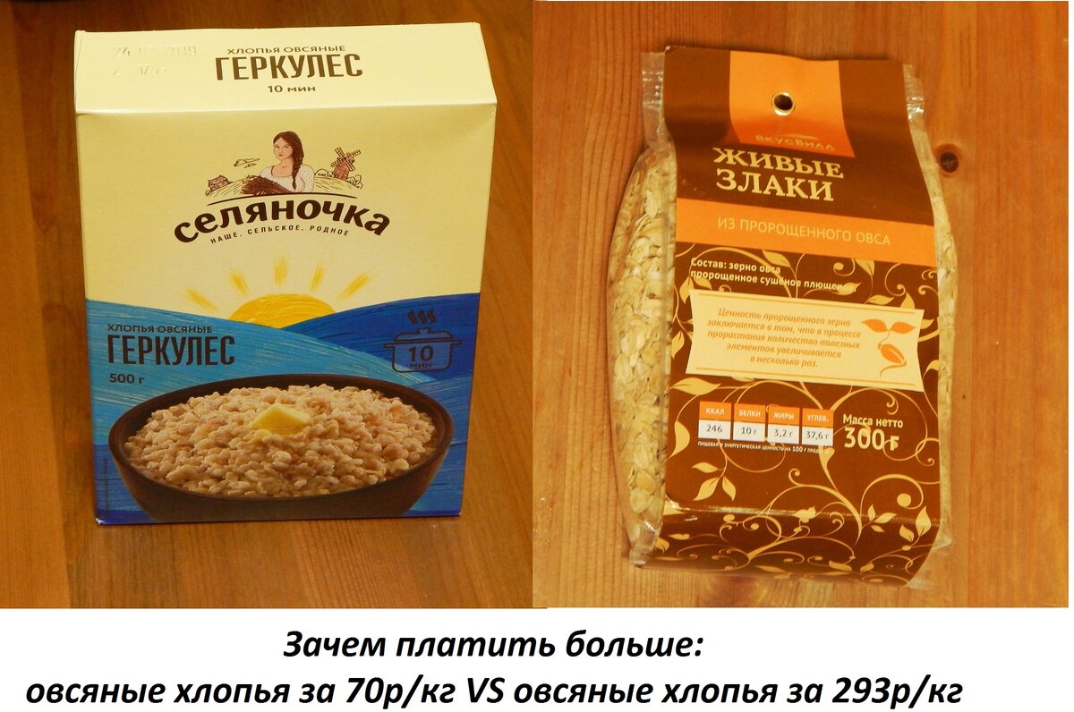 Сравниваем овсяные хлопья за 70р/кг с овсяными хлопьями за 293р/кг