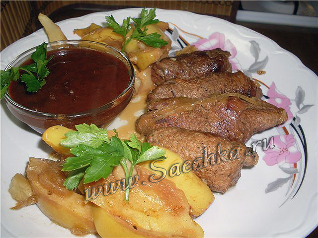 - Телятину разрезать на ломтики, отбить, замариновать на полчасика в специях, соевом соусе, горчице.