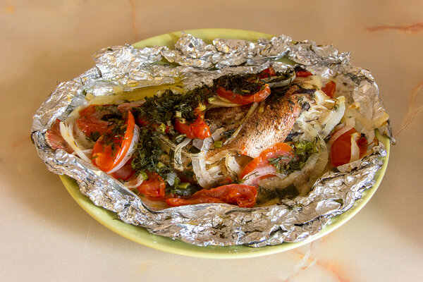 ИНГРЕДИЕНТЫ Крупный окунь речной 1-2 штуки картошка 1 кг лук 2 штуки помидоры 3 штуки зелень (базилик и петрушка) оливковое масло можно и простое соль, сухие ароматные травы, перец молотый чёрный и 1 лимон Речного окуня необходимо очистить от чешуи. Это несложно, если взять тушку за хвост и чистить ножом от хвоста по направлению в голове. Голову, если она есть, отрезать и выбросить как и внутренности. Обязательно очистить внутреннюю полость окуня от черной пленки. Пленка чистится плохо, поэтому стоит постараться с помощью жесткой губки. С речным окунем несколько сложнее, учитывая наличие чешуи, весьма схожей с броней, но тщательно очистить от чешуи очень надо. Тушку окуня надрезать накрест ножом на глубину 5-6 мм по бокам ближе к спинному плавнику с интервалом 4-5 см. При этом надо постараться не повредить реберные кости. Натереть тушку, особенно тщательно надрезы и внутреннюю полость смесью специй и трав: базилик, соль, перец черный — по вкусу, и оставить на 30 мин. Лук очистит