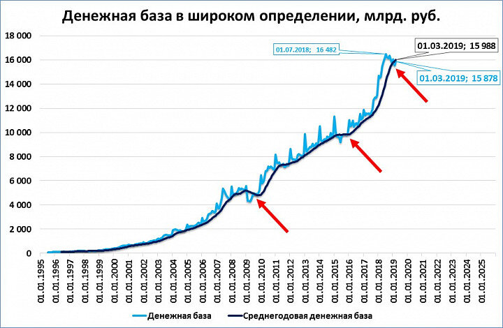 Сейчас реальная денежная база на символические 3,5% больше, чем год назад и находится в шаге от падения. Замедление роста показателя происходит уже с июля 2018 года. Среднегодовые темпы начали замедляться в декабре 2018 года. Подобные замедления ранее (в апреле 2004, августе 2007, январе 2011 года) с временным лагом приводили к падению продаж легковых автомобилей, грузовиков, снижению фондовых индексов. Такие замедления предваряли все «громкие» кризисы в России: 1998, 2008, 2015 годов. Например, перед знаменитым кризисом 1998 года разворот темпов произошёл ещё в апреле 1998 года. Информация негативная. Улучшение наступит, если темпы рост