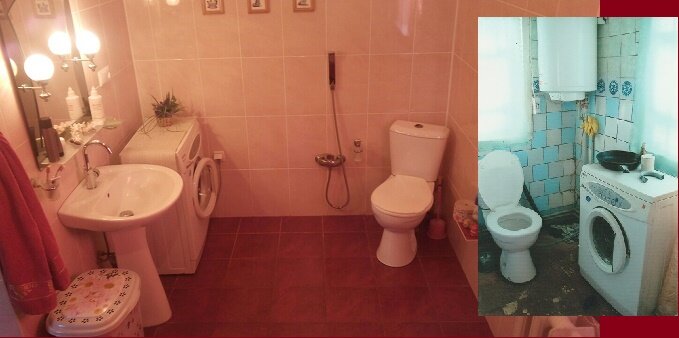 Унитаз передвинули в угол, на место душевой кабины установили стиралку, раковину для мытья посуды заменили умывальником.