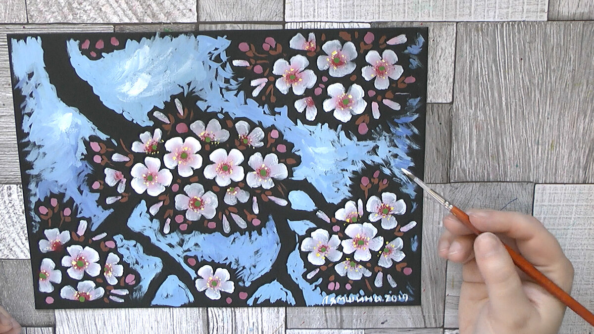 В конце марта в Японии зацветает сакура. У нас с вами вишня распустится прямо сегодня. Мы нарисуем нежные цветы в технике двойного мазка или One Stroke. Инструменты и материалы: 1. Вам нужны плоская синтетическая кисти №10, круглая кисть №2, трафаретная кисть. 2. Возьмите темперные или акриловые краски. 3. Палитра. Подойдет обычная керамическая тарелка или вы можете использовать специальную палитру для акриловых и темперных красок. Для растушевки двойного мазка я использовала бумажную палитру. 4. Черная бумага плотностью 160 - 300 г / м². 5. Карандаш. Для картины лучше возьмите черную бумагу. Она поможет создать ветки, а также тень между лепестками. Карандашом наметьте ветки и пространство для цветов. Наберите на один край плоской кисти белый цвет, а на другой - розовый. Растушуйте границу между оттенками на палитре. Нарисуйте несколько цветов в центре будущей грозди. Некоторые цветы видны лишь частично, какие-то еще не распустились. Возьмите круглую кисть и темно-розовый. Нарисуйте