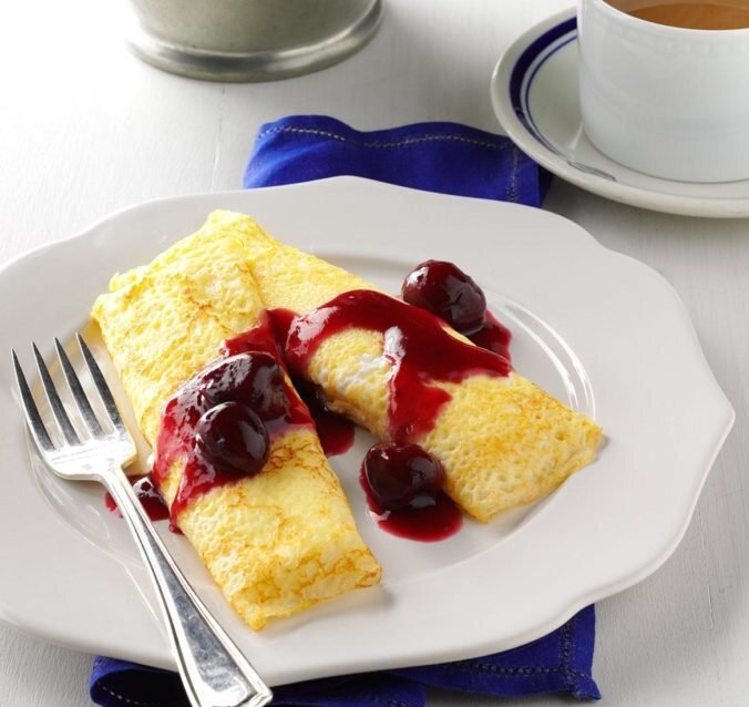 Время на приготовление: около 30 минут на приготовление и 2 часа на подготовительные работы по тесту. Ингредиенты: 1 чашка 2% молока 3 больших яйца 2 столовые ложки сливочного масла, растопленного 2/3 стакана пшеничной муки 1/2 чайной ложки соли Начинка: 1 чашка 4% творога 100 гр сливочного сыра, размягченного 1/4 чашки сахара 1/2 чайной ложки ванильного экстракта Вишневый соус: 400 гр свежей или замороженной вишни без косточек 2/3 чашки воды 1/4 чашки сахара 1 столовая ложка кукурузного крахмала Порядок действий: В маленькой миске смешайте молоко, яйца и масло. Смешайте отдельно муку и соль, добавьте в молочную смесь и хорошо перемешайте. Накройте крышкой и поставьте в холодильник на 2 часа. Нагрейте слегка смазанную маслом сковороду, аккуратно налейте 2 столовые ложки теста в центр. Поднимите и наклоняйте сковороду, чтобы равномерно покрыть дно тестом. Жарьте до тех пор, пока сверху блинчик не подсохнет, после чего переверните и жарьте еще 15-20 секунд. Сложите блинчики с бума