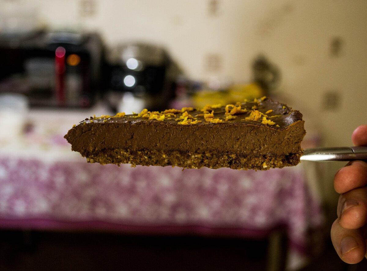 Апельсин и шоколад - союз, заключённый на небесах! И сегодня я вам расскажу, как их объединить в этом вкуснейшем десерте. Мы приготовим шоколадный мусс на основе авокадо и кокосового масла, разбавим его апельсиновым соком, а в качестве подложки будут выступать орехи и финики. Ингредиенты: Для подложки: Для мусса: Помимо этого нам понадобится кухонный комбайн и форма с вынимающимся дном диаметром 24 или 26 см (она не обязательна, но сильно упростит процесс нарезания готового торта): Итак, приступим к приготовлению. И начнём с подложки. 1) Пересыпьте орехи в чашу комбайна из измельчите до консистенции хлебных крошек (буквально секунд 20-30). 2) Удалите косточки из фиников и мелко порежьте. 3) Добавьте к орехам финики и 2 столовых ложки кокосового масла. Измельчайте, пока масса не начнёт собираться воедино. 4) Если долго измельчать - ингредиенты превратятся в жидкую пасту. Нам этого не надо! Остановитесь в тот момент, когда сможете скатать шарик, который будет держать форму. 5) Переложи