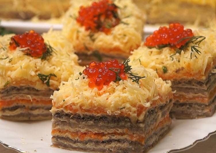 Ингредиенты: Заходите на мой сайт и читайте ещё больше новых рецептов Приготовление: Селедку разделать от костей, рыбное филе измельчить блендером в пюре. Морковь отварить до готовности, затем остудить, почистить и натереть на мелкой терке, либо измельчить в блендере. Лук почистить и вместе с грибами мелко порезать. Обжарить на растительном масле лук с грибами. Снять с огня и дать немного остыть. Сыр натереть на терке. Теперь собираем торт. Для этого первый корж смазать майонез, выложить сельдь, равномерно распределить массу по всему коржу. Сверху немного смазать майонезом (сеточка) и накрыть вторым коржом. На второй корж выложить обжаренные грибы с луком и смазать сеточкой майонеза. Накрыть закуску коржом. На третий корж выложить измельченную отварную морковь, слегка посолить и смазать майонезом. Повторить эти слои еще раз. Верхний морковный слой и бока, смазать обильно майонезом и щедро посыпать сыром. Дать блюду постоять при комнатной температуре не менее 1 часа, чтобы торт п