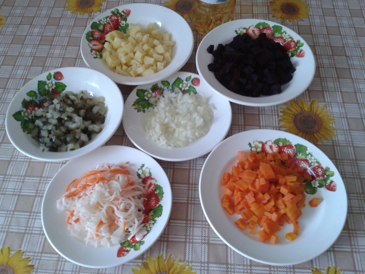 Сейчас мы редко делаем винегрет, не заслуженно забытый. Решила я его приготовить, как еще моя бабушка и мама готовили. Ингредиенты простые и общедоступные, так как это овощной салат, то он еще и бюджетный получается. И так, нам потребуется: Свеклу, морковку и картофель режем кубиками. Лук мелко режем, (так вкуснее и он практически не чувствуется.) Капусту как есть, оставляем в первозданном виде. Огурцы режем кубиками, но поменьше, чем свеклу. Все смешиваем и добавляем растительное масло. Этот салатик хорошо подойдет к постному столу. Приятного аппетита! Ставьте лайк и оставайтесь на моем канале.
