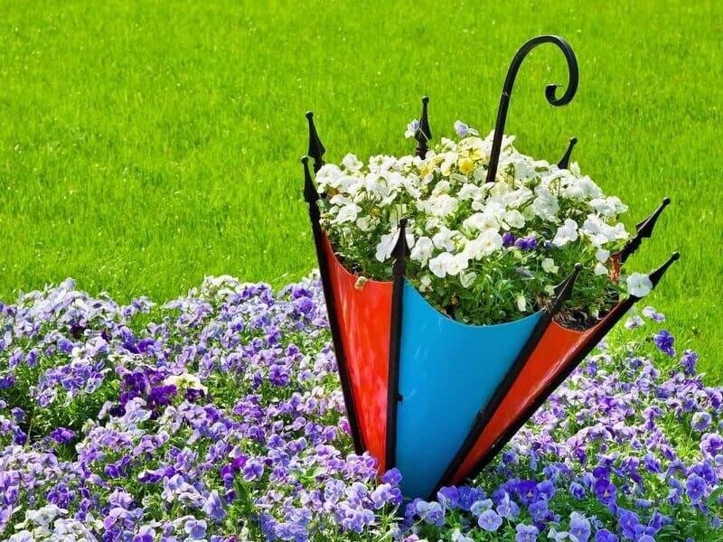 Из старого сломанного зонта можно сделать оригинальную клумбу. Для этого достаточно положить его в раскрытом виде на землю и укрепить, а на самое дно поместить емкость с растениями. Зонт уникален и тем, что его можно подвешивать. А значит, изготовить из него просто и подвесную клумбу.