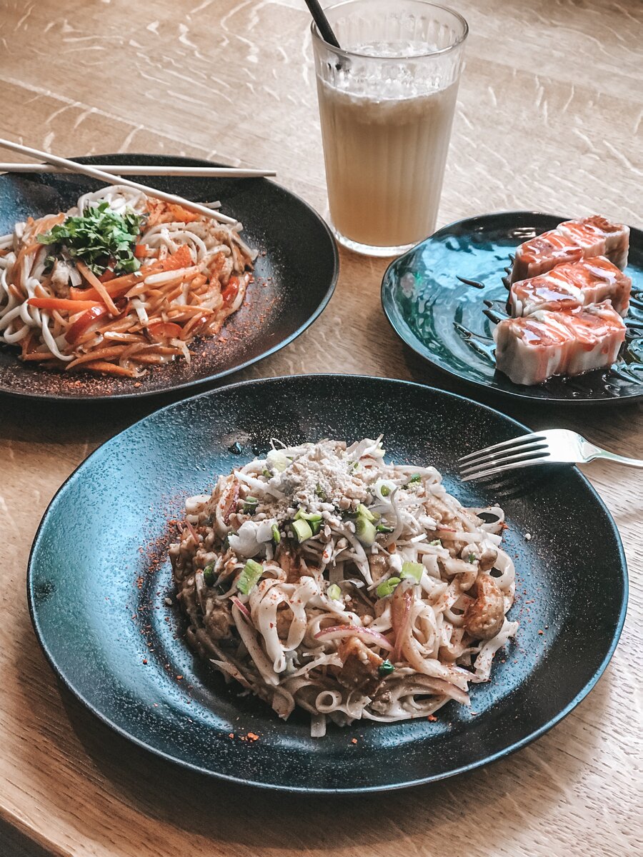 Салат микс с тофу (250₽) холодные зимние черри, перегородки от пекинской капусты, ничем не заряженный тофу. Хорошо, что у ребят есть уксус с чили, он немного спас ситуацию. Пустые калории. Фо бо 500 мл (270₽) имбирь, кружки чили, ростки сои и долька лайма — в комплекте. Бульон хороший, не уверена, что восьмичасовой. Соленый сильно, повар влюблён, весна в Петербурге. Несколько слайсов хорошей говядины, мята, лемонграсс не чувствуется, корица правит. Хороший суп, дельный, только соленый. Тайский лимонад (150₽) я отчетливо чувствовала в нем вкус джина! Видимо, есть анис в составе. Терпко, вкусно, необычно. Сладкий ролл (190₽) фрукты, сливочный сыр, клубничный соус. Вкусно. ⠀ Экзотический перекус для тех,