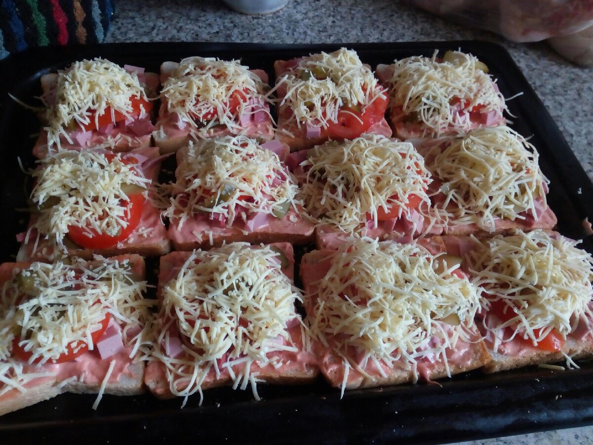 Если к вам нагрянули неожиданно гости и вам нечем их угости, предлагаю вам быстрый рецептик пиццы (гости не останутся равнодушными) Вам понадобится: -хлеб бутербродный (квадратный) -колбаса ( у меня 2 вида) - помидоры - огурцы ( у меня соленые) -сыр -для соуса кетчуп , майонез Приготовление: Колбаску нарезаем кубиками или ломтиками как вам больше нравится , огурцы и помидоры нарезаем полукольцами сыр натираем на терке. Выкладываем наш хлебушек на противень , смазываем каждый кусочек соусом , выкладываем колбаску ,помидорки, огурчики и посыпаем сверху сыром . Ставим в духовку на 15-20 минут в духовку при 180 градусов Таким образом готовы наши мини пиццы !! Приятного аппетита!