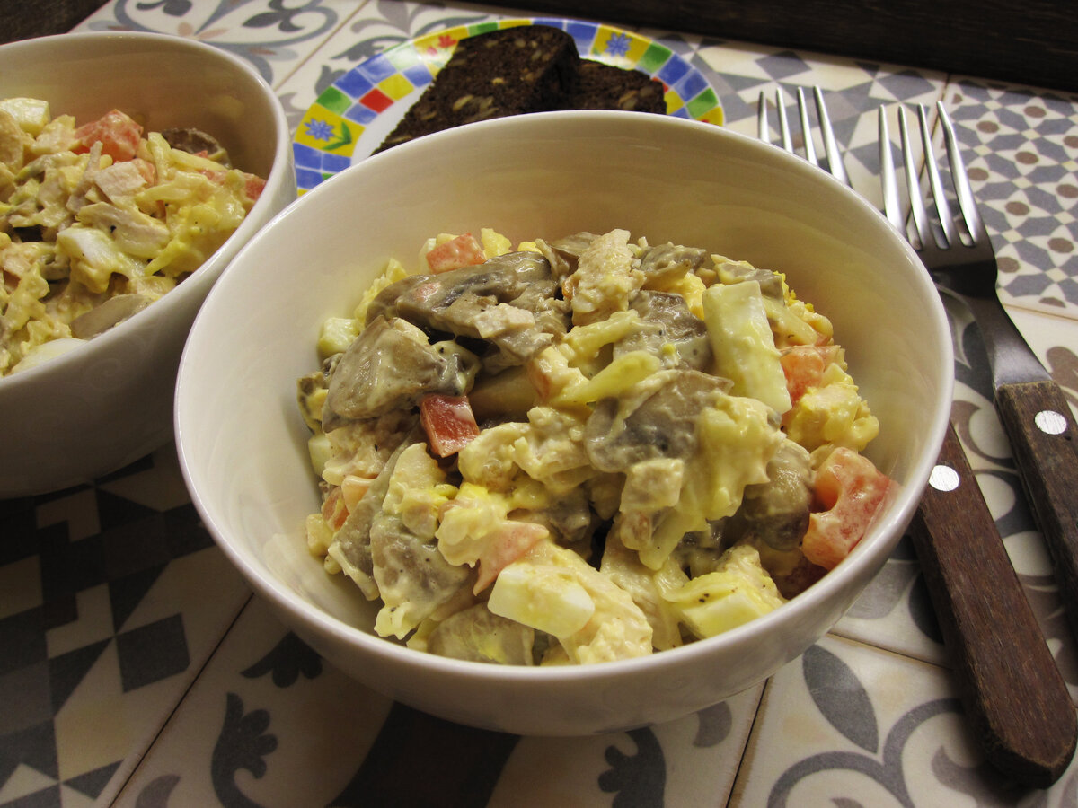 Самый вкусный салат из доступных продуктов! Попробуйте его и будете готовить этот салат постоянно. Очень вкусный и довольно сытный получился салат. Ингредиенты: Шампиньоны - 250 грамм Куриная грудка - 1 штука Яйца - 2 штуки Помидор - 1 штука Твердый сыр - 50 грамм Соль и перец Майонез Как приготовить салат "Жозефина": 1. Подготовьте продукты. Отварите курицу и яйца. 2. Мелко нарежьте или порвите на волокна курицу. 3. Нарежьте шампиньоны. 4. Поджарьте на подсолнечном масле на открытом огне. 5. Натрите сыр на крупной терке. 6. Мелко нарежьте яйца. 7. Мелко нарежьте помидоры. 8. Положите все ингредиенты в посуду. 9. Добавьте соль, перец и майонез. 10. Тщательно перемешайте. Салат "Жозефина" готов! Приятного аппетита! Подписывайтесь на мой Фуд Бук, ставьте лайки и делитесь рецептом в соцсетях!