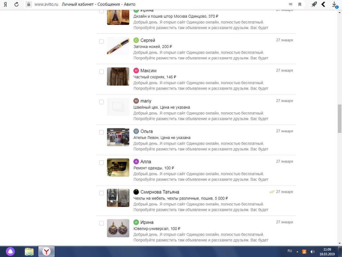 Добро пожаловать на мой новый канал и на первый пост про интернет, борьбу и развитие. Увидев большое количество недовольных людей, которые требуют отечественную доску объявлений, меня посетило вдохновение и надежда на то что мой проект заинтересует людей и они проникнутся духом социального проекта. Этот пост посвящен про рекламу в сообщениях на Авито и мой опыт, которым я хочу поделиться с Вами. Из-за отсутствия денег на рекламу проекта, я стал искать альтернативные пути развития сайта Одинцово онлайн. Я подумал, а почему не попробовать рассылать личные сообщения людям на Авито, они уже продают и пользуются сервисом, может получится их переманить на свою сторону? Я заварил чашку чая, я бы сказал гигантскую кружку, на пол литра и приготовился, производить точечную бомбардировку по пользователям сайта Авито. Я разослал довольно быстро в ручном режиме 50 сообщений с призывом продавать на моем сайте, заняло это меньше 20 минут и оставалось ждать результата. На следующий день я проверил в