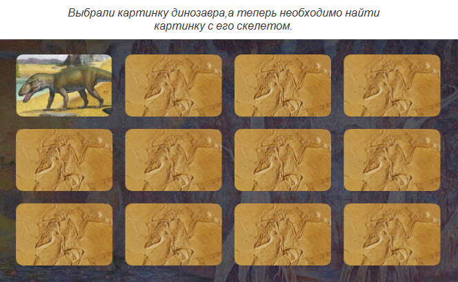В онлайн игре «Мемори» с динозаврами представлены карточки динозавров и их скелетов. Необходимо найти две картинки одного динозавра, его самого и его скелет. Угадав правильную комбинацию из двух картинок, откроется страничка с описанием этого динозавра, о том, сколько лет назад и где он обитал. Кому интересно, могут поиграть тут: «Мемори» с динозаврами.