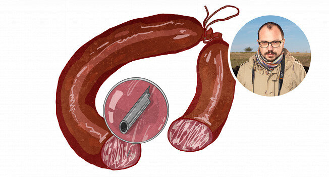 РОМАН ЛОШМАНОВ ОБ ОБРАТНОЙ СВЯЗИ ОТ ПРОИЗВОДИТЕЛЕЙ ПРОДУКТОВ Недавно я обнаружил в колбасе иглу. Точнее, когда я чуть не сломал себе об нее зуб, то не знал, что это игла. Это был двухсантиметровый металлический тонкий и полый обломок чего-то. Только потом я заметил на нем скос, характерный для иглы. Даже хорошо, что кончик его был обломан, — был бы острый, кто знает, что было бы. Я эту колбасу нашел совершенно случайно, в супермаркете возле дома (я вообще часто покупаю и пробую новые продукты из чистого любопытства). Она называлась домашней сырокопченой из свинины, а на невзрачной упаковке было написано: «Премиум-качество». Но упаковка была прозрачной, и колбаса выглядела очень даже достойно, а по цене ее можно было бы сказать, прикинув в уме цены на мясо, что сделана она именно из него. Колбаса оказалась гораздо лучше, чем я ожидал. По вкусу она напоминала даже не сырокопченую, а сыровяленую. Это был такой хороший российский продукт, на отсутствие которых любят жаловаться столь мн