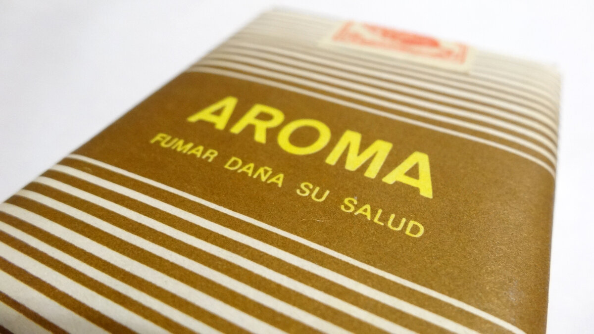 Продолжаем знакомится с кубинскими сигаретами времён СССР! И сегодня это продукция Cubatabaco, сигареты "Aroma". В Союз эти сигареты поставлялись с 1960-х годов, а производились до 1990-х. О том, производятся ли "Aroma" сейчас мне ничего не известно. За всю историю производства сигарет дизайн и тип пачки не менялся ни разу. Пачка всегда была "мягкой", а дизайн состоял из белого фона и полосок разной ширины цвета табачного, ну или наоборот)) В центре всей этой полосатой композиции находились жёлтые буквы обозначающий имя бренда и предупреждающая надпись о возможном вреде курения. О том, что сигареты именно от Cubatabaco мы узнаём лишь по фирменному логотипу. И это всё, что можно узнать о хозяине "Aroma". Надпись ниже - предупреждает, что сигареты "лёгкие". Сигареты упакованы в фольгу на толстой бумажной основе, а верх пачки перехвачен фирменной лентой с указанием изготовителя. Если дизайн пачки не менялся за всё время выпуска, то вот смена производителя (хотя возможно только имени) имел