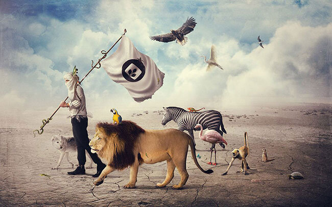 Начните добавлять животных. Найдите изображение льва – я использовал эту фотографию с Photolia – вырежьте его аналогичным методом, который использовался для предыдущих элементов, и вставьте в документ. Увеличьте яркость/контраст, визуально выделив животное, затем примените те же техники освещения и теней, что были выполнены для мужчины.