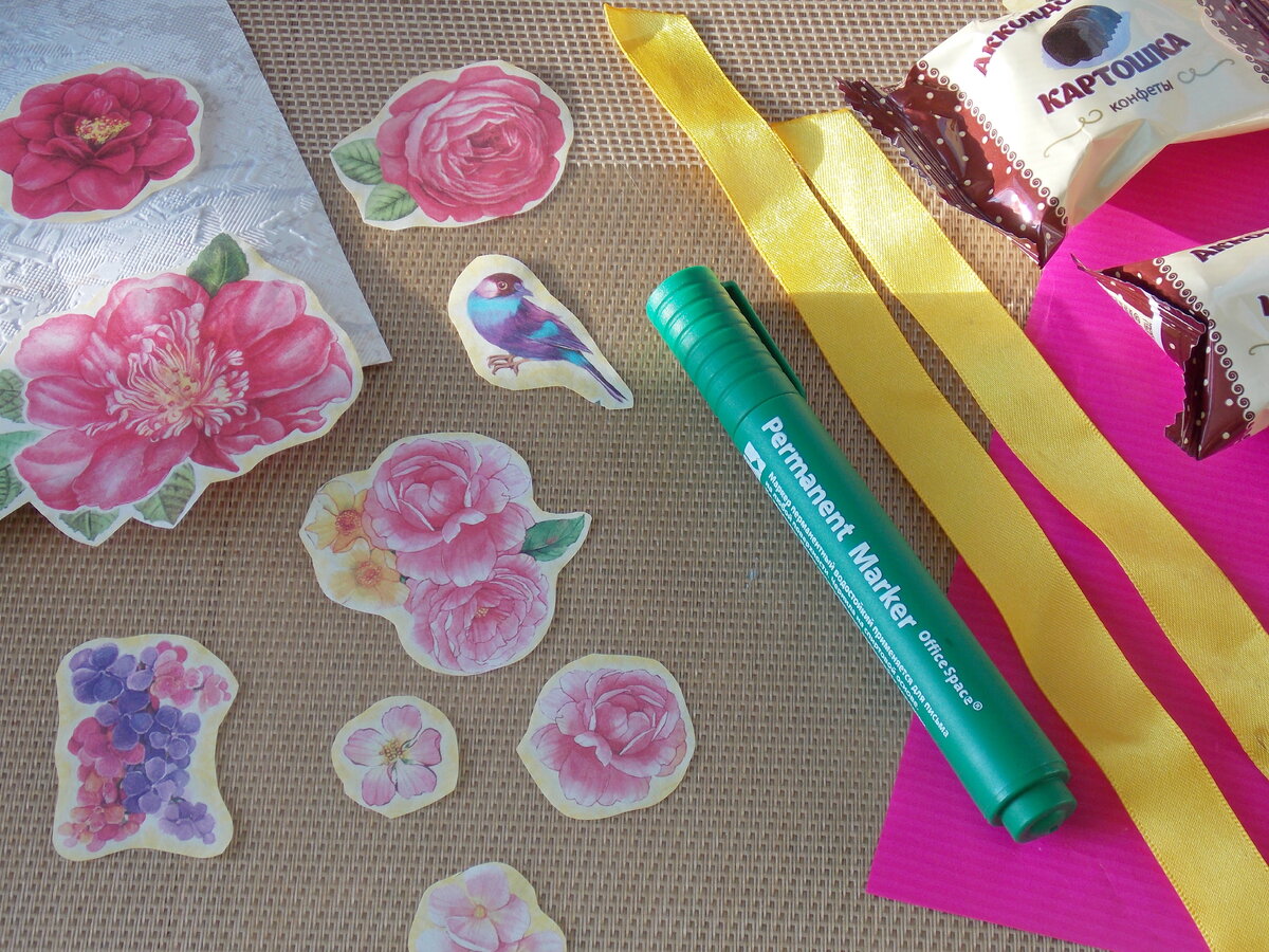 Всем привет! Поздравляю всех своих подписчиц - умниц, красавиц и рукодельниц С праздником 8 марта!!! Желаю всем умелицам много новых творческих идей, свободного время для воплощения этих идей и пусть домашние дела подождут...!!! В этот раз решила сделать небольшие подарки, так сказать чисто символические, чтобы порадовать своих коллег (жаль всех "охватить" не могу, но все-равно всех люблю). Можно взять конфеты, ручки, маркеры или что душе угодно. Так же еще понадобится: плотная бумага (обои или картон), упаковочная бумага или пленка, ленточки и декор. Закручиваем в обои трубочкой наши подарочки (маркер и конфетка). Заклеиваем на скотч. Затем закручиваем в упаковочную бумагу, она должна быть больше с краев на 5-6 см. чем обои. Оставшиеся края упаковочной бумаги собираем и завязываем ленточкой. Получается такая конфетка. Декорировать ее можно по-разному. Я наклеила картинки декупажа. Все можно дарить! С праздником девчонки! Подписывайтесь! Впереди весна и много новых идей!
