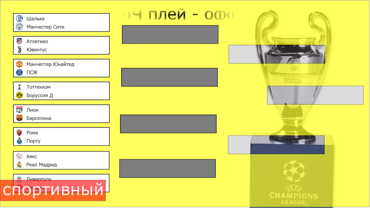 Привет. В четвертьфинал Лиги Чемпионов пробилось уже 4 клуба, а 4 места ещё остаются вакантными.