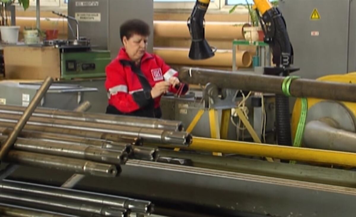 Женщина работает в сервисном центре по ремонту и промысловому обслуживанию установок электроцентробежных насосов. Цех даёт вторую