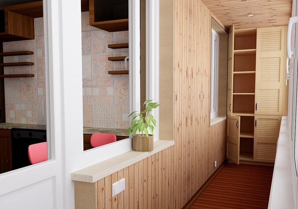 Обшивка деревянной вагонкой. Это отделка балкона с применением отделочного материала такого как вагонка, изготовленная из массива хвойных пород, преимущественно сосны. Вагонка имеет различные толщины и различный внешний вид, различное сечение что позволяет придать нужный заданный вид помещению. Часто используется классическая прямая вагонка, но по желанию можно сделать и из вагонки повторяющей вид бруса, бревна, полукруглой формы, блок-хаус так называемый. Балкон обшитый вагонкой получается теплым, выглядит очень уютно. Вагонку обязательно нужно пропитать антисептиком, это защищает древесину и позволит служить более долго. К тому же можно придать любой цвет, так как антисептики производятся разного цвета, к тому же можно еще покрыть лаком, что придаст еще больше красивый вид. Вагонка из массива хорошо сохраняет тепло, что является преимуществом при выборе материала для теплого балкона. Вагонка деревянная это прекрасный материал для отделки, красивый и очень уютный.