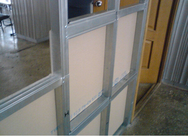 Обшивка каркаса материалом делается так, чтобы блоки максимально тесно прилегали. После чего все соединения закрепляются черными саморезом. Если установка перегородки подразумевает организацию звуковой или тепловой изоляции, то после первой установки первой стороны перегородки как раз далее устанавливают утеплительный материал. После чего монтируется вторая сторона перегородки.
