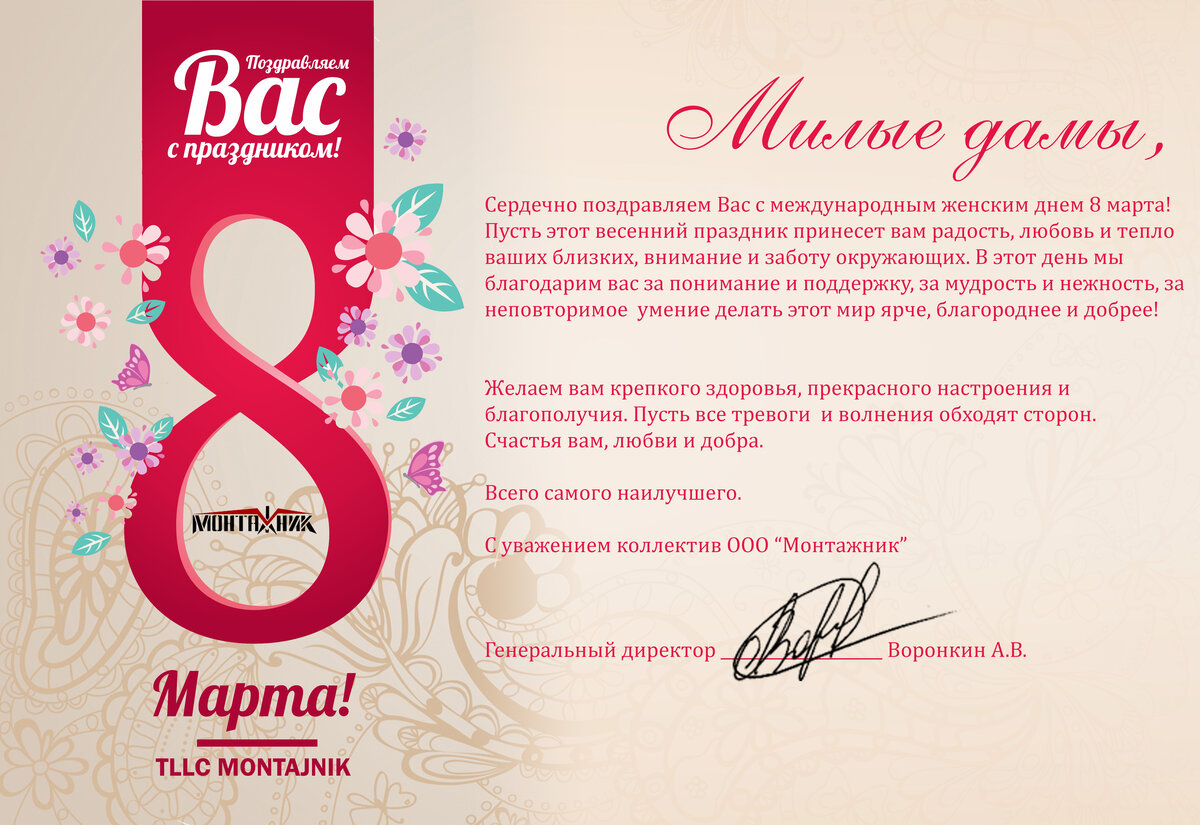 Примите самые искренние поздравления с чудесным весенним праздником – Международным женским днём 8 марта!