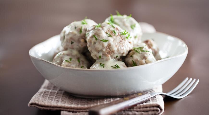 4.Для приготовления соуса слегка обжарить муку на сухой раскаленной сковороде до золотистого цвета. Добавить сливочное масло и постепенно влить сливки. Перемешать, влить бульон и посолить. Довести до кипения. Поместить в соус фрикадельки, снова довести до кипения и готовить 2-3 минуты. Подавать фрикадельки, полив их сливочным соусом.