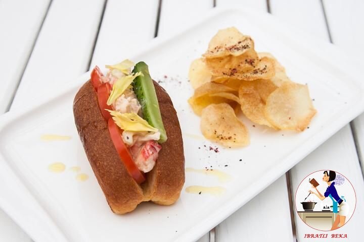 Yengil tamaddi uchun ajoyib tanlov! Ajoyib gazak o'rnini ham egallaydi. Taomnoma uchun chinakam yangilik. Dasturxon davrasida barcha uchun ma'qul bo'ladi. Ushbu retseptni albatta tayyorlang! Kerakli masalliqlar: 1 dona gamburger bulochkasi 50 gramm qisqichbaqa tayoqchasi 50 gramm mayonez 80 gramm ketchup 20 ml konyak 30 gramm pomidor 3 gramm selderey 30 gramm tuzlangan bodring 15 gramm kartoshka chipsisi Zaytun va o'simlik yog'i Tayyorlash usuli: 1. Pomidorni yumaloq shaklda kesing. 2. Seldereyni to'rg'ang. 3. Mayonez, kutchup va konyakni birlashtiring. 4. Qisqichbaqa go'shtini maydalang va saryog'ni birlashtiring va mikrato'lqinli pechda yoki tovada isiting. 5. Qisqichbaqa go'shti, selderey, ta'bga ko'ra qalampir, mayonez aralashmasini birlashtiring va yaxsgilab aralashtiring. 6. Bulochkani ikki tomonini saryog' yoki o'simlik yog'ida qovuring. O'rtasidan ikki qismga bo'ling. 7. Pomidor bo'laklari, qisqichbaqali asos, tuzlangan bodring bo'lagini soling. Selderey bargi bilan bezating