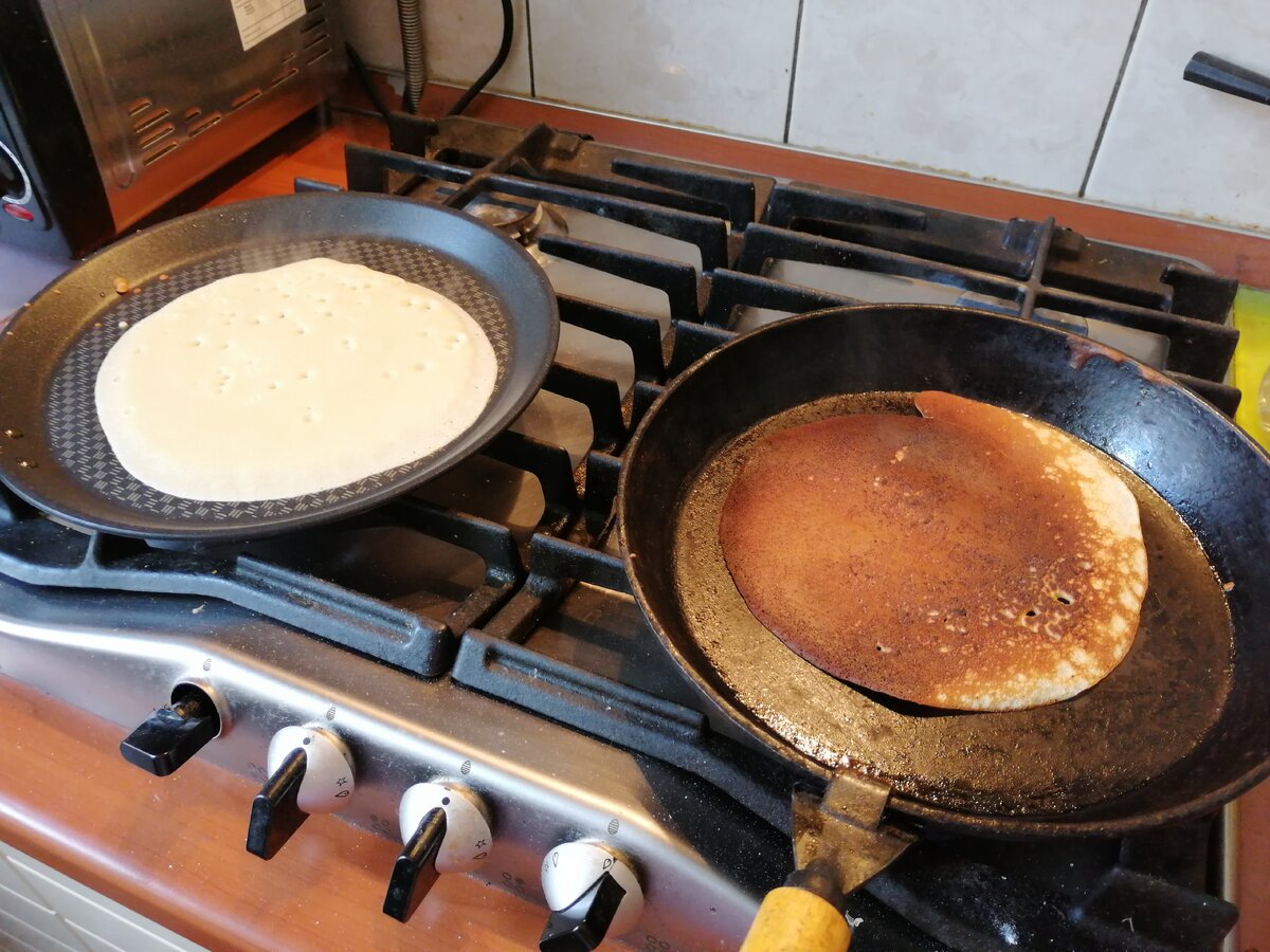 Чугунная сковородка в целом хороша. Но, поскольку ею довольно давно не пользовались, и используется она не только для блинов, то на некоторых блинах оставался черный нагар.