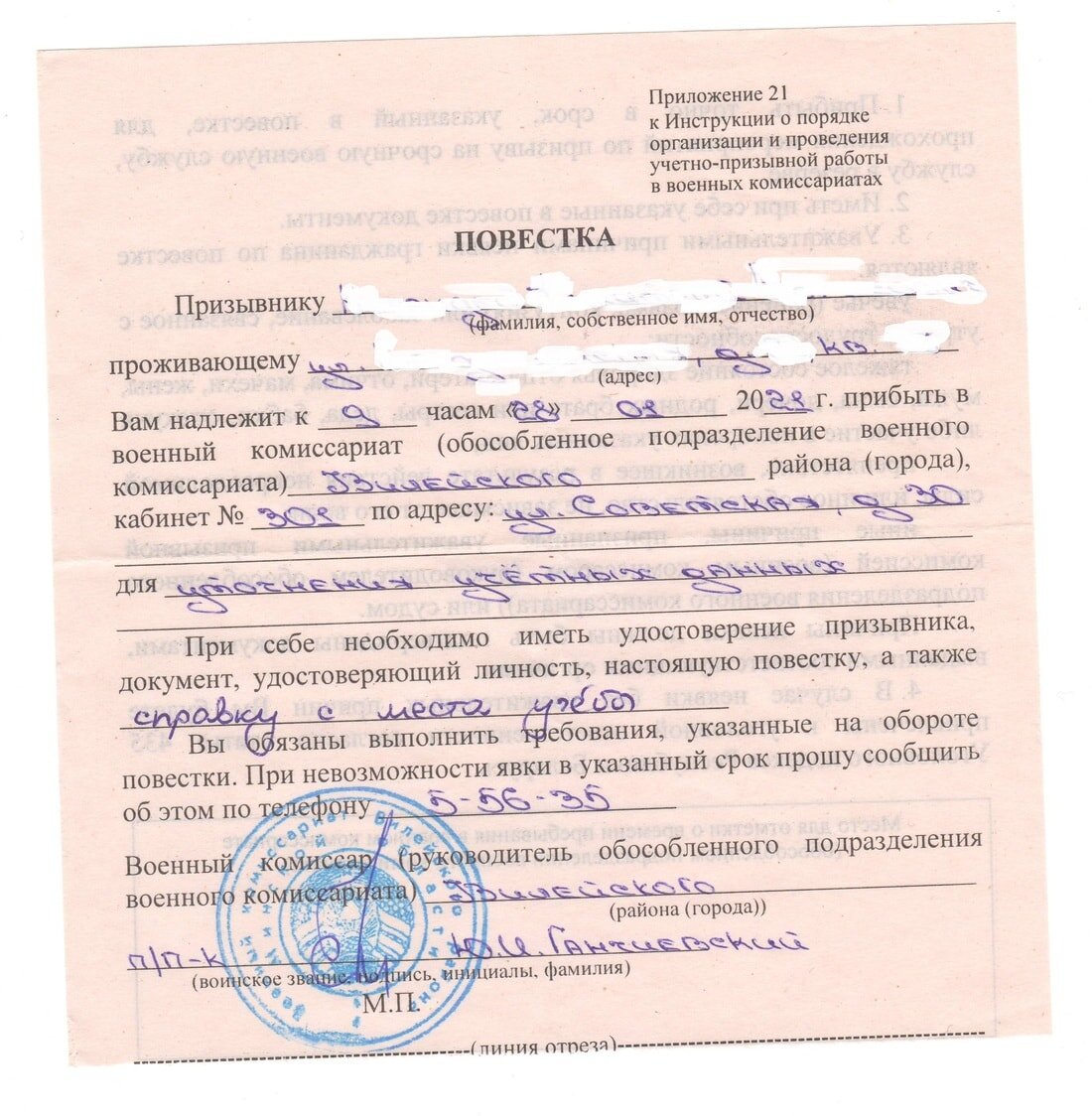 Будущему призывнику всего 16. На днях он выполнил свой первый долг перед родиной, сходив в военкомат за приписным. В военкомате не растерялись и вручили подростку еще одну бумагу — повестку на 2021 год. Теперь отец мальчика всерьез боится потерять ее или забыть. Мы позвонили в военкомат Вилейского района. Там вежливо объяснили, что это нормальная практика. — Бывает, и на 5 лет вперед вручаем. Впервые постановка на воинский учет граждан происходит в год достижения 16 лет. Мы выдаем удостоверение призывника. С 16 до 18 лет с ними, откровенно говоря, мало что происходит. В год достижения 18 лет, который и выпадает на 2021 год, мы решаем вопрос о призыве их в армию. — А зачем с таким запасом по времени? — Это потом каждому повестку отправь — лишняя трата денег. А когда они к нам приходят на постановку впервые в 16 лет, тогда мы им дает повестку и напоминаем, что, когда исполнится 18, они должны будут явиться. — Эта повестка имеет такую же юридическую силу, чтобы неявку по ней считать ук