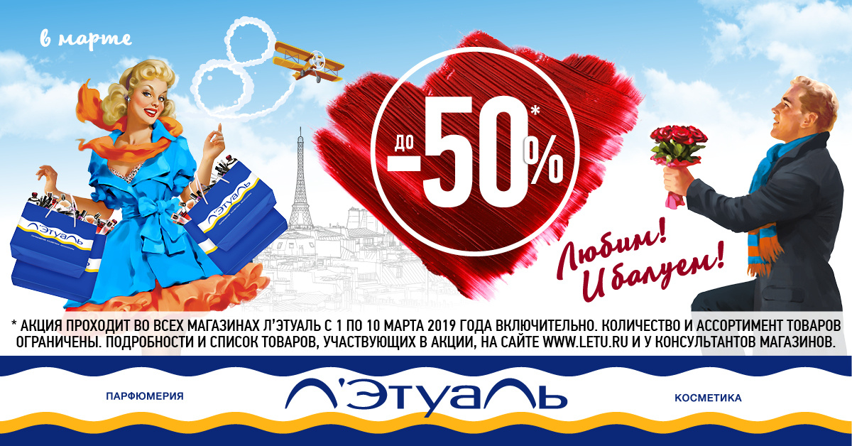 Сейчас на сайте Лэтуаль проходит замечательная акция. Магазин проводит скидки в подборке до 50% на очень большое множество товаров: косметические наборы, туалетная вода и тд. В общем кому интересно, заходите и выбирайте. Ация проводится до 10 Марта торопитесь порадовать свою 2 половинку! Ссылка на скидку: Нажми на меня Так же не забудь подписаться, что бы не пропускать эксклюзивные акции!