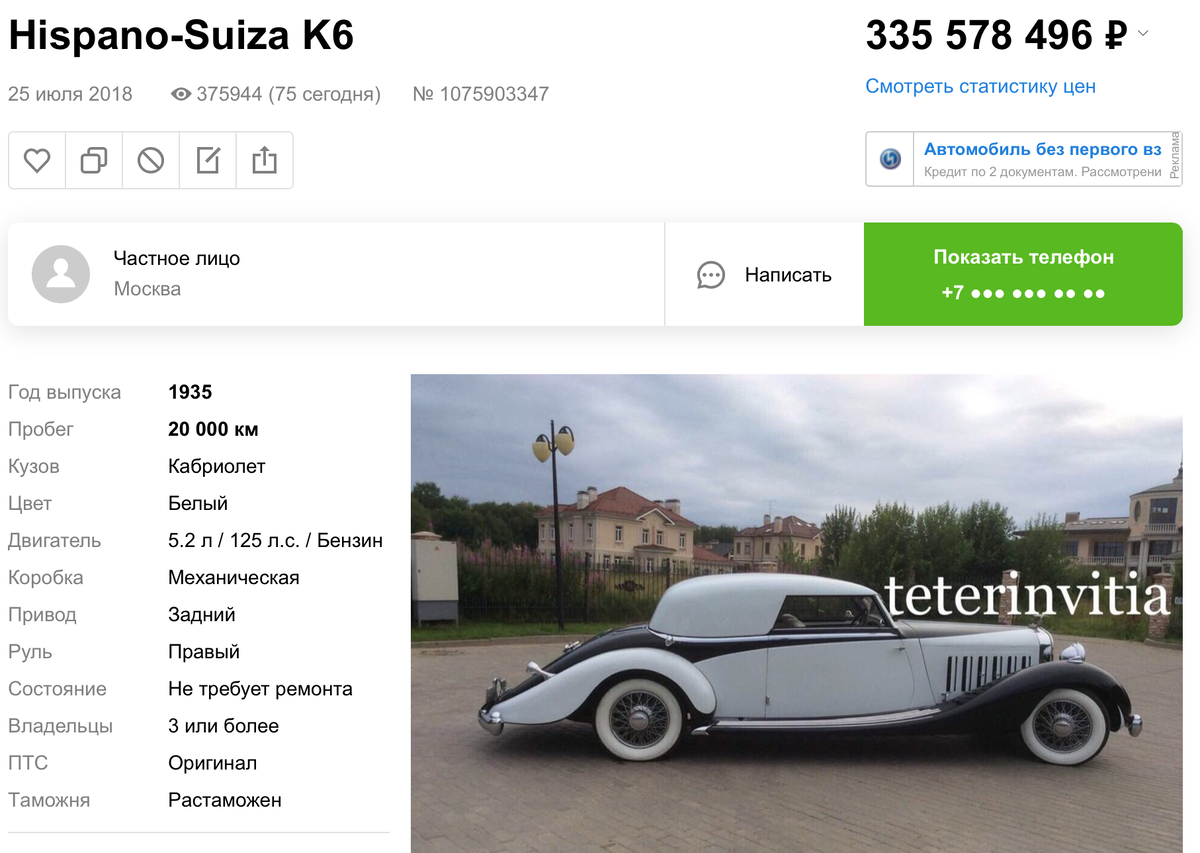 Привет всем ценителям автомобилей! Сегодня у нас будет подборка из пяти самых дорогих объявлений о продаже автомобилей, взятых с сайта Auto.ru. Поехали: 1. Hispano-Suiza K6 1935 года выпуска за 335.578.496 рублей Одна из последних моделей что осталась в мире. Некогда в середине 30-х годов этот автомобиль символизировал собой роскошь и технологии того времени европейского уровня. 2. Ferrari LaFerrari за 255.000.000 рублей Классика итальянских суперкаров, выпуск 2016 года с гибридным двигателем в отличном состоянии. Ценник явно завышен, так как автомобиль не является редкостью, в Европе его стоимость ниже процентов на 30. Стоит обратить внимание что по Москве на таком автомобиле комфортно передвигаться невозможно (если вообще возможно). За пределами Москвы тем более. 3. Horch 853 1939 года выпуска за 150.000.000 рублей Horch 853 - один из редчайших ретро автомобилей на данный момент в мире. Последний из автомобилей продали на аукционе Сомерсби в 2014 году за 11.000.000 долларов. Судя по