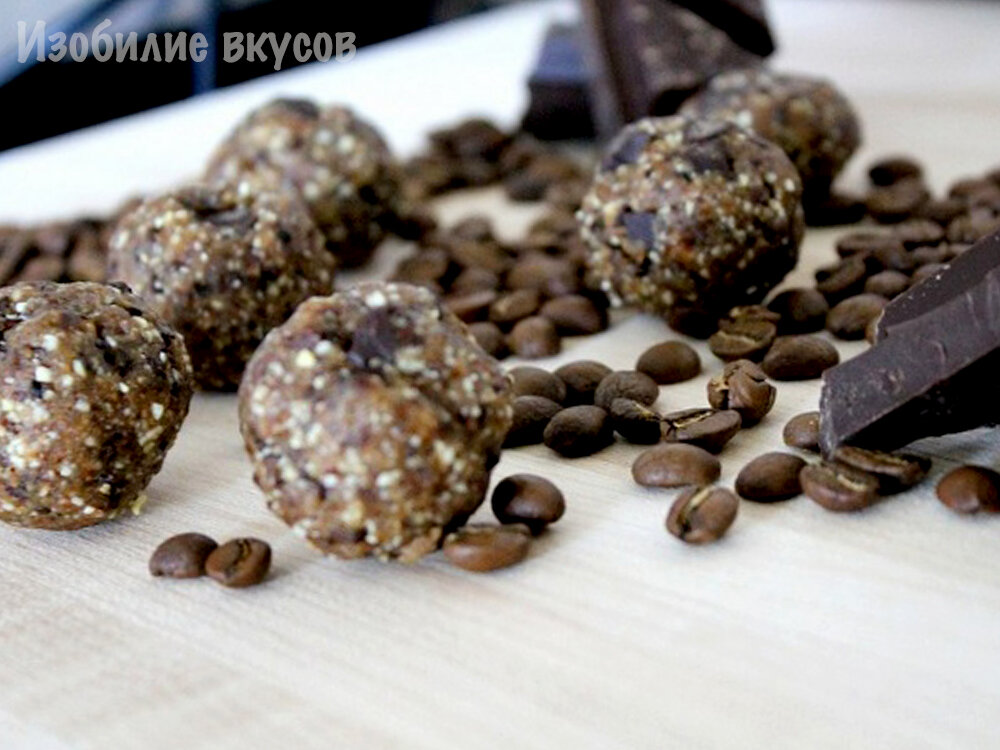 Орехи и кофе размешиваем. Финики и перемешиваем до образования однородной массы. Наломать шоколад на кусочки или натереть на терке и смешать с массой.