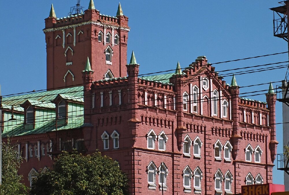 Здание бывшей колбасной фабрики Кизнер и Глок. Фабрика была основана в 1902 братьями Кизнер: Яковом, Осипом, Константином и Иваном, со временем к ним присоединился Андрей Глок. Находится здание на углу улиц Челюскинцев и Октябрьской. У него очень выразительный внешний вид: островерхие башенки, шпили, узорная кирпичная кладка.