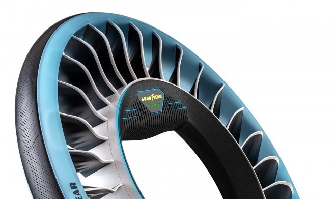 Компания Goodyear представила на Женевском автосалоне свои разработки для летающих автомобилей. Безвоздушные шины Goodyear Aero должны выполнять свои стандартный функции при движении автомобиля по поверхности земли и функции пропеллера при полете. Взамен дисков используются спицы в форме винта.