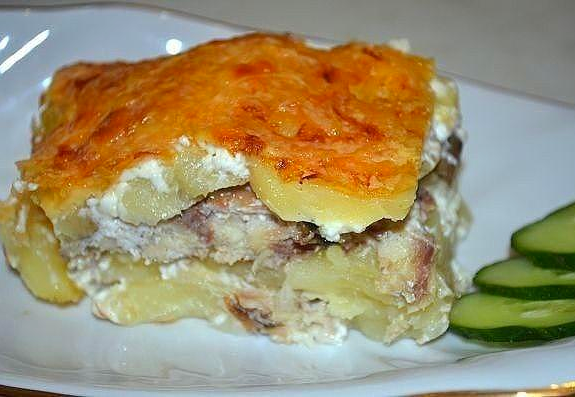 Форму смазываем маслом, выкладываем половину картофеля, солим, перчим и смазываем сметаной. Выкладываем кусочки скумбрии, снова солим, перчим и смазываем рыбу сметаной либо майонезом. На рыбу кладем оставшийся картофель, опять соль и перец, сметана. Посыпаем сверху тертым сыром.
