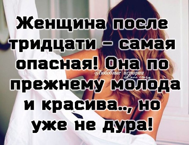 Женщина после 30 самая опасная. Она по-прежнему молода и красива, но уже не дура.