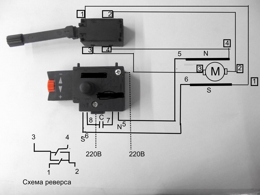 3-провод щетки от якоря, 4-провод статора(N). Если смотреть наглядно, то имеем подключение крестиком " Х ". Переходим на саму кнопку: 5-вход статора (N),