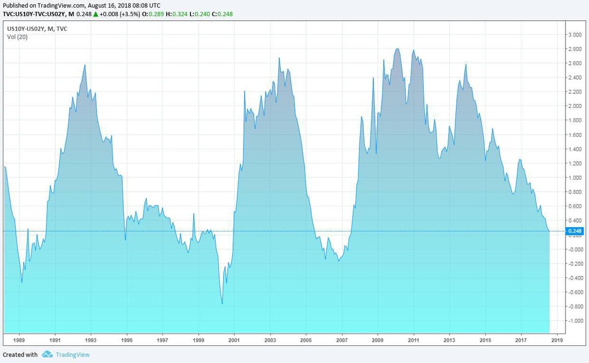 Публикация от 17.08.2018 Кривая доходности американских трежериз продолжает уплощаться. Вчера был обновлён минимум 2007 года: спред 10-леток и 2-леток достигал 23,4 базисных пункта. Т.е. инвестор за размещение своих денег на 10 лет вместо 2-х получает премию по доходности в размере всего лишь 0,23% годовых. В этой ситуации инвесторы должны покупать короткие долги и продавать длинные - тогда кривая возвращается к нормальному, наклонному виду. Но проблема в том, что короткие ставки ориентируются на текущую ставку ФРС (исторически двухлетки превышают Ставку федеральных фондов на 0,4%), и пока ФРС продолжает ужесточать политику, ближний конец кривой будет расти. А так как рынок ждёт рецессию в США (текущий рост ВВП второй по продолжительности за всю историю), при которой ставки придётся снижать в 2020-х годах, то длинные ставки рынок оставляет низкими. Самое интересное начнётся, когда кривая полностью инвертируется, т.е. спред коротких и длинных бумаг станет отрицательным. На графике👇?