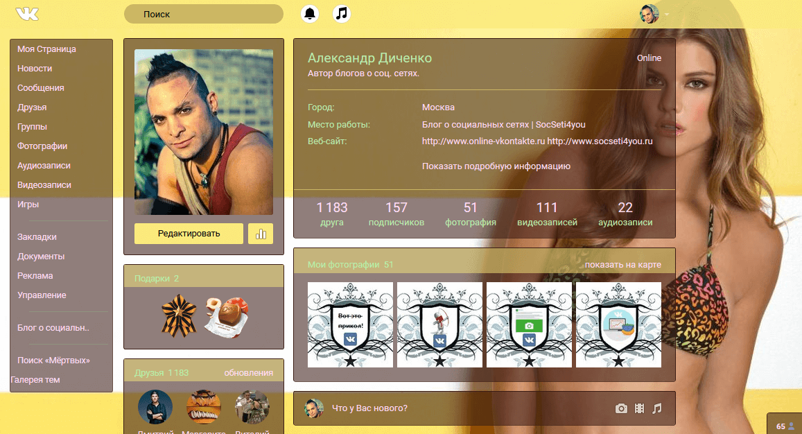 Как сделать дизайн своей страницы в ВК супер красивым??? Есть простой совет!!! Каждый активный пользователь хотел бы красиво оформить личную страницу в ВК, чтобы выделиться среди своих друзей и знакомых. Сейчас мы рассмотрим основные моменты, которые необходимо знать для улучшения своей страницы. Наверняка многие пользователи Вконтакте хотели бы приукрасить свою личную страничкуоригинальной темой. Сделать это очень просто, всего лишь в 3 простых действия. Для этого понадобиться сайт с темами и простое расширение (плагин) для браузеров. Как установить темы для Вконтакте 1. Переходим на сайт Get-styles.ru, где будем выбирать тему. В правой колонке скачиваем последнюю версию плагина для браузера: Плагин поддерживается в браузерах: 2. Теперь выбираем тему. На сайте их очень много, смотрим по категориям. Как только Вы нашли ту самую, которую хотели бы увидеть у себя на страничке, нажимаем на кнопку "Применить": 3. Обновляем страничку Вконтакте и наслаждаемся новой темой. Ставим лайк