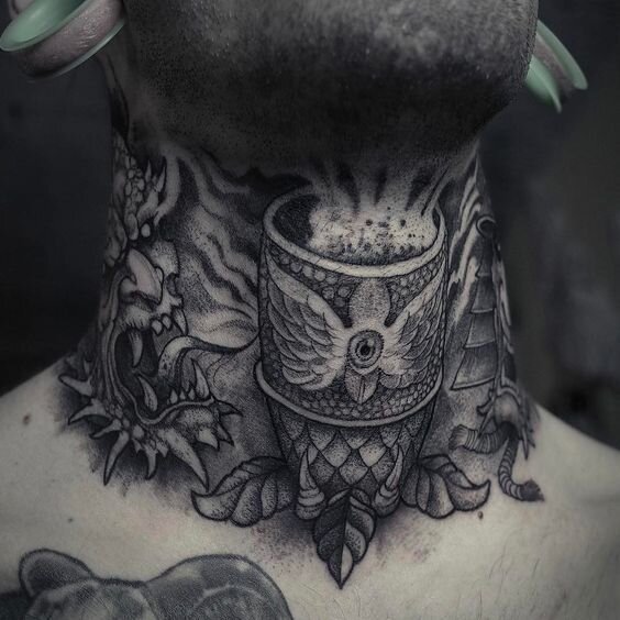 В современном мире мужские татуировки призваны привлечь к себе внимание и сделать акцент на неординарности хозяина. На первый взгляд они выполняют лишь эстетическую функцию, хотя каждая из них является рисунком со смыслом. Для тех людей, которые предпочли мужские тату на шее, не существует особых преград. Это касается и выбора рисунка, который также не имеет ограничений. Располагаться он может с любой стороны, размеры подбираются по вкусу хозяина. Маленький эскиз будет смотреться так же хорошо, как и обширная композиция, которая захватывает помимо шеи часть спины и плечо либо часть головы. Татуировки на шею для мужчин в виде надписей являются наиболее популярными среди остальных видов тату. Они могут быть выполнены на различных иностранных языках. Особое внимание стоит обратить на китайские и японские иероглифы, которые великолепно смотрятся на мужской шее, но требуют тщательного изучения. Нужное понятие или изречение стоит перепроверить не в интернете, а у знающего язык человека.