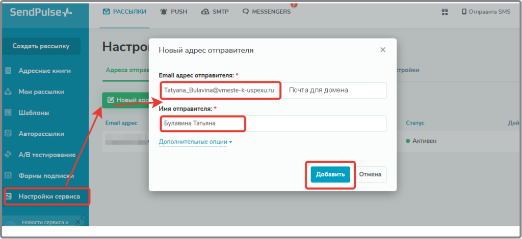 В первую очередь нам нужно добавить адрес отправителя, то есть адрес доменной почты, который мы регистрировали здесь.