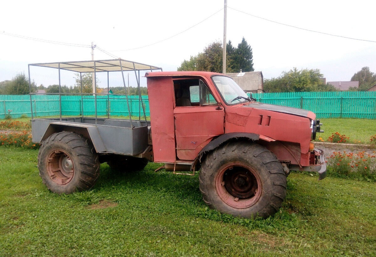 В деревне Верясско Новгородской области на продажу выставили очень странный самодельный вездеход, сделанные из элементов сразу нескольких автомобилей отечественного производства. Он может стать вашим всего за 140 тысяч рублей. Вездеход на огромных колесах от Урала (так называемые "ободрыши") имеет сочлененную конструкцию. Т.е. кабина с двигателем и грузовой отсек представляют собой две раздельные секции, соединенные шарниром, как у тракторов К-700 "Кировец". Кабина и капот - от ВАЗ-2101. Облицовка радиатора вместе с фарами - от УАЗ-469. Под ней расположена лебедка и мощный стальной бампер от какого-то старого грузовика. Так как привод тут передний, то под капотом оказался "восьмерочный" четырехцилиндровый мотор, который работает в паре с механической коробкой передач также от ВАЗ-2108 и вращает передние колеса через понижающую передачу. Передняя панель - от "копейки", руль - от "Волги" ГАз-3110. Никакой пластиковой отделки - лишь голый металл. Ну и правильно, всякие украшательства ни к